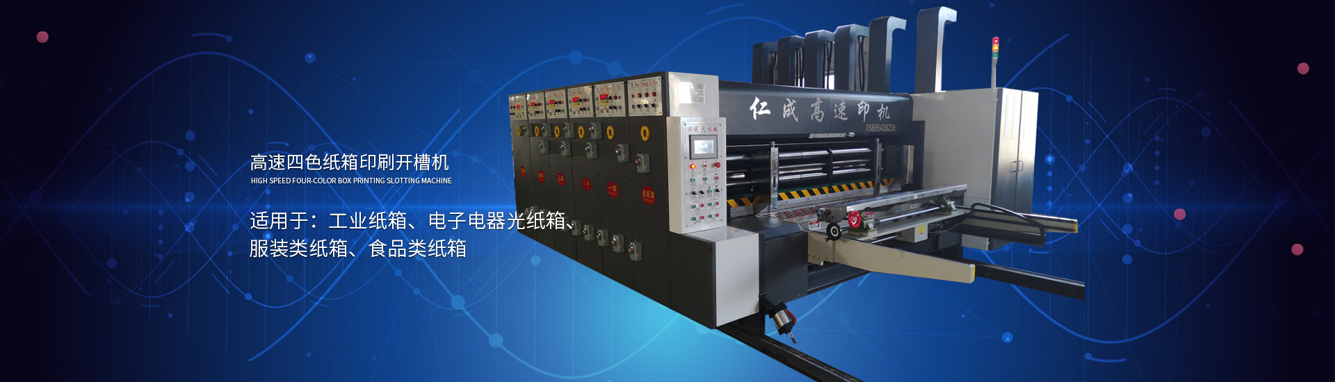主要產(chǎn)品: 紙箱印刷開槽機, 高速印刷開槽模切機,自動插格機,釘箱機,粘箱機,仁成包裝機械,紙箱機械